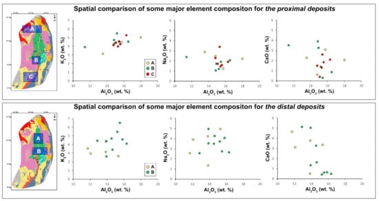 Spatial comparisons of some major element composition for the proximal and distal deposits. Each sample group shows similar range of major element composition, respectively.