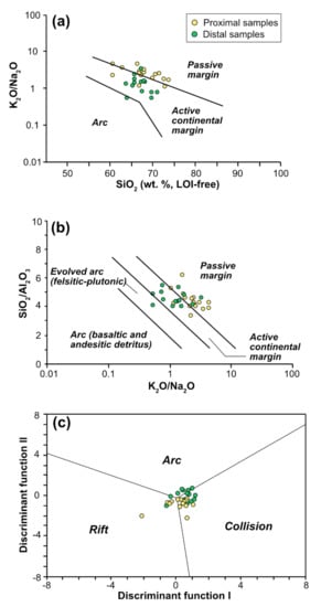New discriminant-function-based diagrams by Verma and Armstrong-Altrin (2013) [] can discriminate tectonic settings of sedimentary rocks to three types: island or continental arc, continental rift, and collision. In this diagram, the proximal deposits are plotted near the boundary between the arc and collision fields (Figure 9c), possibly reflecting their derivation from source rocks, including volcanic rocks, metamorphic and metasedimentary rocks. The distal deposits are not overlapped with the proximal deposits in the diagram, indicating the compositional difference between the two sample groups. The distal deposits are plotted near the boundary between the collision and rift fields (Figure 9c). Source rocks for these samples are likely to be composed of metamorphic and metasedimentary rocks and felsic plutonic rocks.