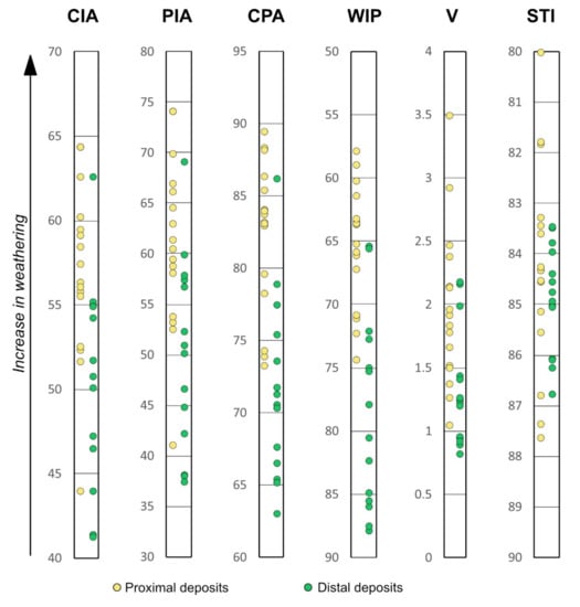 The CIA is the most widely used weathering index, monitoring decomposition of feldspar grains and consequent formation of Al-rich clay minerals such as illite and kaolinite []. Fresh igneous rocks are found to have a CIA value between 45 and 55, whereas moderately weathered shales such as PAAS yield a value closer to 70 []. The CIA values of the mudstone samples range from 44 to 64, with an average of 56, indicating a minor degree of chemical weathering. Although the proximal and distal deposits show some overlap in their CIA values, they can be separated roughly at the CIA value of 54 (Figure 10). The CIA values of the proximal deposits range from 49 to 64, with an average of 59, indicating minor chemical weathering in the source areas. On the other hand, the value of the distal deposits ranges from 44 to 63, with an average of 52, indicating little alterations in the source areas. Weathering indices such as the Plagioclase Index of Alteration (PIA; []), the Chemical Proxy of Alteration (CPA; []), the Vogt’s residual index (V; []), and the weathering Index of Parker (WIP; []) are also formulated to assess the leaching of mobile elements such as Na2O, CaO, and MgO during weathering processes. In this study, they provide similar results with those of the CIA value (Figure 9). A low degree of chemical weathering is inferred for the distal deposits, and these samples are distinguished from the more weathered proximal deposits. The Silica–Titania Index (STI; []) is the only weathering index that showed a similar degree of chemical weathering for the proximal and distal deposits. The STI values of the proximal and distal deposits range from 80 to 88 (av. = 84) and 83 to 87 (av. = 85), respectively, indicating a slightly weathered condition [].