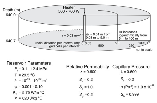 The 1D TH model is conceptualized as a single, cylindrically symmetric layer with 0.7-m thickness and a 100-m lateral extent, the latter of which approximates a semi-infinite radial dimension for the time-scales of interest for this study (Figure 5). The heater is represented by a single grid cell with a radius of 0.03 m and is the inner boundary for the model domain. Beyond the heater, 499 0.01-m grid cells grew up to 5.0 m, then from 5 m to 100 m—the grid cells grow with a constant factor compared to their neighbor. The high resolution of the grid near the heater is chosen to minimize discretization errors where strong gradients and abrupt changes in hydrgeologic parameters are expected to occur [40]. This one-dimensional model treats the heater geometry more realistically than the spherical analytical solution, but it does not represent the presence of the access drift or the unheated portions of the borehole. The DRZ is defined as the 1.25 m after the heater element within the model domain. To model the effects of fracture-matrix flow within the DRZ, the multiple interacting continua (MINC) method is utilized to produce a dual-porosity model representative of fractures induced by drilling/excavation in salt. The MINC method allows for the partitioning of the flow domain into separate computational volumes within each physical element [41]. Since the MINC method is used to represent matrix-to-fracture heat transfer, here the volumes are partitioned into matrix and fracture volumes. We parameterize the MINC formulation by assuming parallel-plate fractures and assigning 98% of the total grid cell volume to the matrix continuum and the remaining 2% to the fracture continuum. This results in the DRZ, being composed of the 124 matrix and the 124 fracture grid cells. Matrix blocks are assumed to have the same properties as intact salt because fractures are characterized by much larger diffusivities than intact salt, which results in early system response being dominated by fractures, whereas late time response is more influenced by the matrix. The MINC method has been implemented in numerous modeling studies focusing on engineered geologic systems, such as CO sequestration [42], enhanced geothermal systems [43], waste water disposal [44], and petroleum reservoirs [45]. Initial conditions involve two different boundary conditions, an atmospheric boundary condition (75% relative humidity, 0.101 MPa, and 29.5 C) at the heater representing connection of the borehole to the drift air and a far-field condition of fully saturated ( = 1), 12 MPa, and 29 C representative of the conditions at 640 m depth at the WIPP [46]. These initial conditions on the borehole and in the far field were held constant during the transient simulation. With these boundary conditions and a 1.25-m region defined as the DRZ, both pressure and gas/liquid saturation are allowed to equilibrate for roughly 5 months, to account for pressure reduction and desaturation that occurred in the time between the drilling of the boreholes at the BATS site and the beginning of testing (Figure 6).