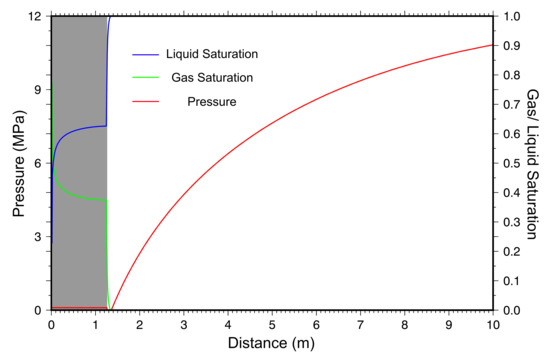 Pressure and liquid/gas saturation initial conditions for each 1D simulation. The shaded grey region represents the extent of the DRZ and the double-porosity portion of the mesh, which extends 1.25 m from the heater.