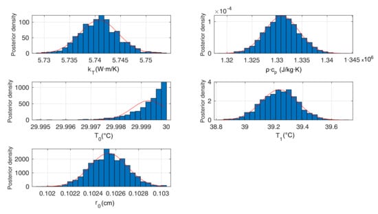 Parameter estimation with the analytical solution was performed using DREAM, a Markov chain Monte Carlo (MCMC) global gradient-free optimizer [38]. DREAM was used to estimate five parameters, , , two borehole wall temperatures , , and . Each of the parameters was given a wide parameter range and a uniform prior distribution across that range. The cavity radius was estimated because treating the borehole as a spherical cavity is an idealization. The temperature applied to the borehole wall was also estimated to account for some uncertainty in the applied temperature (the controlling thermocouple on the borehole wall was set to 120 C) and possible inefficiencies in heat transfer to the salt (e.g., some applied heat is re-radiated back to the equipment in the borehole or carried away in the stream of dry nitrogen gas). By using all the temperature and applied power data to constrain the solution, and allowing the major parameters in the solution to be fit, we are trying to better understand the actual information content in the data.