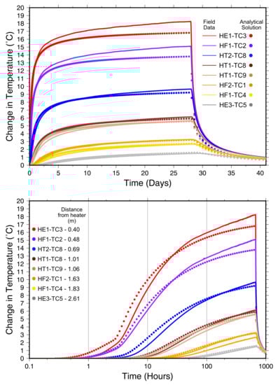 Analytical solution for best fit parameters at 8 thermocouples. The top panel shows the predicted temperature at each thermocouple in linear time and the bottom panel shows the temperature fits in log-time. The field data are denoted by solid lines and the modeled temperature are the corresponding colored circles.