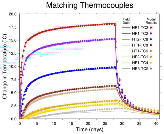 Numerical modeling results for change in temperature at three thermocouples in-plane with the heater over time. The solid lines represent the temperature measured in the field and the dots represent the modeled temperature at each location.