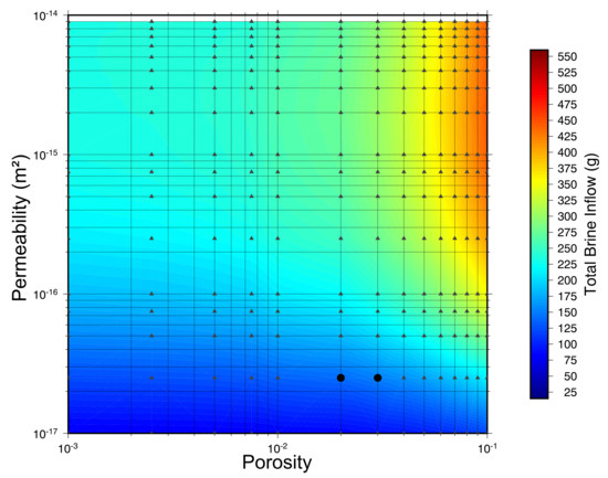To further characterize the BATS field site, an ensemble of 1D TOUGH TH simulations is run to investigate brine inflow into the heater borehole. This ensemble consists of 249 combinations of permeability and porosity for the DRZ. Each parameter combination is shown in Figure 10 by dark gray triangles, the ensemble covers permeability ranging from to m and porosity from 0.001 to 0.10. Each simulation is run for 41 days corresponding the heating and cooling phases of the field test. The brine production response of a heated borehole is complex, with exponentially decaying brine production due to pressure changes, and changes in bulk permeability due to thermal expansion, stress changes, and changes in fracture aperture in the salt. We simplify the very complex brine production problem by examining cumulative brine production at the end of a heating and cooling cycle. A brine surface response map of total brine inflow during these 41 days is shown in Figure 10. Varying the hydrological parameters of the DRZ results in the total brine inflow varying from roughly 15 to 565 g. The actual amount of brine inflow measured in the field is 180 g over the course of the experiment, the best parameter combination (two black circles in lower-right of Figure 10) to match this volume of brine inflow are for a permeability of m with a porosity of 0.02 and 0.03. To provide context on how much heat has an effect on the amount of brine and brine inflow, these two best-fit simulations were run again without a heat source. Each simulation resulted in ≈35 g less brine flow into the heater borehole, which illustrates the coupled nature of just the TH response in the salt. The temperature distribution, derived here solely from heat conduction, is responsible for a large portion of the brine production (i.e., thermal expansion of brine as an additional driving force). These permeability values fall within the range of expected permeability from to m reported in Beauheim and Roberts [15]. This range of permeability over seven orders of magnitude exemplifies the possible values present with the DRZ. However, more recently borehole permeability testing was conducted as part of BATS in a heated borehole within the WIPP underground [54]. The results from a series of pressure decay tests resulted in a permeability value between 2.0 to m, which agrees with the results presented here within a very narrow range. These permeability values are also comparable to two well-known studies conducted at WIPP. Stormont [19] utilized gas permeability measurements in salt to quantitively delineate the DRZ from intact salt. Stormont [19] showed that permeability within the DRZ can range from 10 m near the borehole/excavation and decreases to ≈ m up to 2 m away. Pfeifle and Hurtado [55] presents laboratory data from creep and hydrostatic compression tests in order to characterize the evolution and healing of damaged salt. These laboratory tests resulted in permeability values of damaged salt ranging from to m.