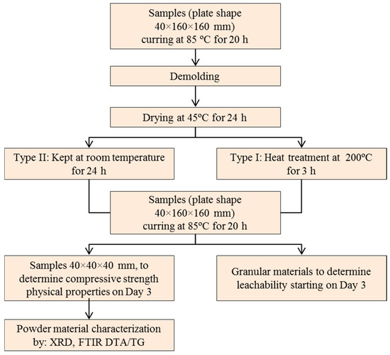 After, two series of samples were prepared: Type I—FA_0, MK_0, MK + FA_0 without heat treatment and type II—FA_200, MK_200, MK + FA_200 with heat treatment at 200 °C for 3 h (Figure 1). Monolithic cubes (40 mm × 40 mm × 40 mm) and granules (2–4 mm) were prepared from the obtained samples (40 mm × 160 mm × 160 mm) before and after the heat treatment (Figure 2). Cubes were obtained using a hacksaw machine and granules were obtained by mechanical crushing and sieving through 2 mm and 4 mm sieves. After the mechanical test, the samples were ground into powder for the next tests, with a determination of the true density, XRD, FTIR, and TG/DTG.