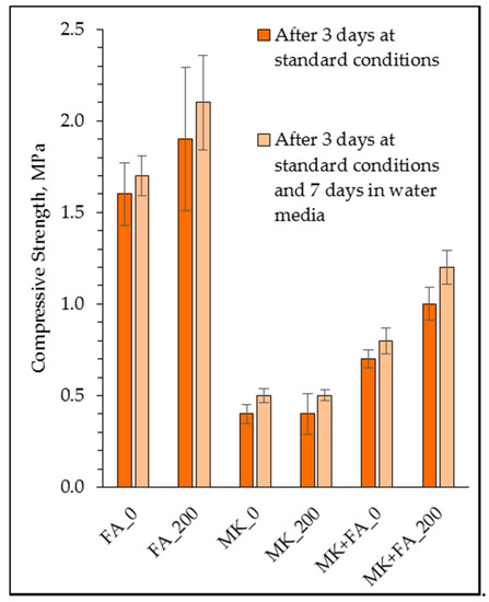 The compressive strength of pAAM is shown in Figure 3. The samples made from FA had higher compressive strength at day 3 (1.6 MPa before heat treatment (FA_0) and 1.9 MPa after heat treatment (FA_200)) than samples made of MK or of MK + FA mix. Heat treatment did not influence compressive strength of specimens made of MK (0.4 MPa at day 3). The samples based on the FA and MK blend had compressive strength 0.7 MPa before heat treatment and 1.0 MPa after heat treatment.