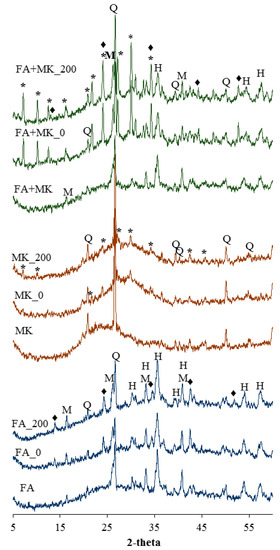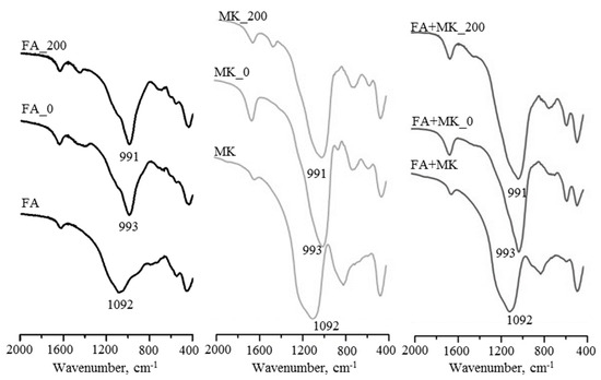 After the heat treatment, no significant changes were detected in the FTIR spectra. In the case of the sample based on MK and FA + MK, the main band moved from 995 cm−1 to 999 cm−1 (in the case of MK) and from 1002 cm−1 to 1006 cm−1 (in the case of FA + MK). This is explained by the SiO2 (from raw MK) transformation from the crystalline/semi-crystalline to the amorphous phase as well as the N-A-S-H gel formation during the heat treatment. In the case of the sample based on FA treated at 200 °C, a different phenomenon was detected; the main band at 993 cm−1 moved to 991 cm−1.