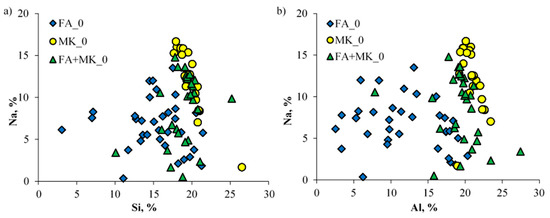 As can be seen in Figure 8a, the sample with FA had less sodium and silica in its structure compared to other samples (MK_0 and MK + FA_0). The difference in the amount of sodium can be explained by the L/S ratio used for pAAM preparation (Table 2). The L/S ratio of FA_0 was 0.32, while the L/S ratio of MK_0 was 0.92 and MK + FA_0 was 0.57. This means that samples made with FA had less sodium in the material composition, which came from the alkali-activation solution or activator. The different amount of silica in each composition depended on the chemical composition of raw materials used for preparation of pAAM (Table 1). FA had less silica oxide than the MK (39.03 versus 53.74%) and more Fe (i.e., 19.05% of Fe2O3), while in MK, the Fe2O3 was less than 1%.