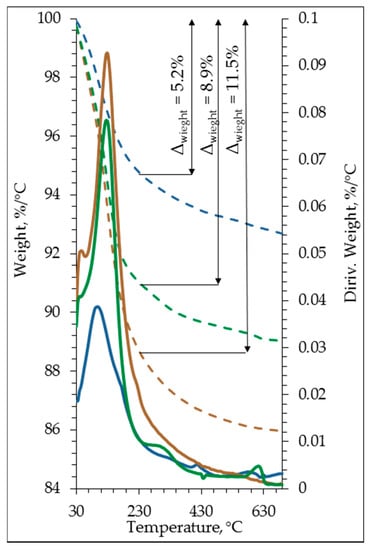 TG/DTG of obtained porous AAM (dashed—TG, solid—DTG): FA_0—blue, MK_0—brown, FA+MK_0—green.