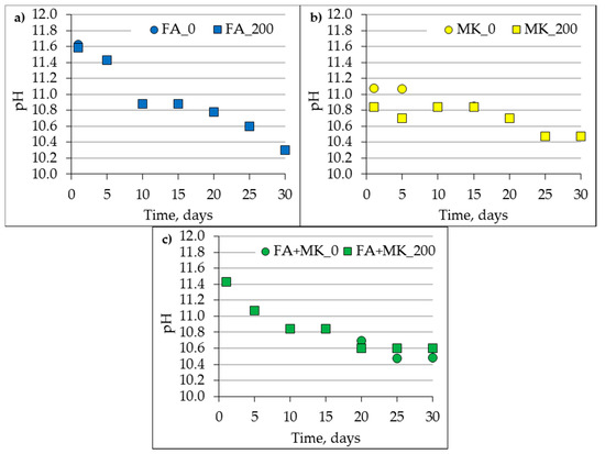 The pH changes in time (a) for samples FA_0 and FA_200; (b) for samples MK_0 and MK_200; (c) for samples FA + MK_0 and FA + MK_200.