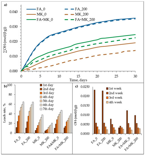 Since the most intense leaching was detected during the first week of the experiment for pAAM containing FA, the percentage of the leached OH− during the respective time period was calculated (Figure 11b). In the first seven days, samples with fly ash (FA_0) leached up to 65% from the total OH− ion amount leached during the 30-day period, while samples with metakaolin (MK_0) leached only up to 41%; samples with the FA and MK blend (MK + FA_0) leached up to 50% (Figure 11b). As mentioned previously, the heat treatment changed the leaching intensity for the pAAM containing MK. The steadiest OH− leaching was observed in sample MK_200 during the first week (Figure 11b) and during the whole testing period (Figure 11c).