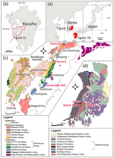 Geological map of the Gyeongsang basin in southeastern Korea (after Lee et al. 2018) [19] and the Amakusa Islands (after Saito et al. 2010) [23] with sample locations. (a) East Asia map including Korea and Japan. The positions of Kyushu and the Gyeongsang Basin are marked in red. (b) The inset within Kyushu marks the location of the Amakusa Islands and Uto Peninsula, where the Cretaceous Himenoura and Goshoura groups are distributed. (c) The distribution of the Cretaceous Himenoura and Goshoura groups and sampling locations from them are shown. (d) It is a schematic geological map of the Cretaceous Gyeongsang basin and also shows the sampling locations in the Hayang Group.
