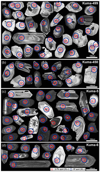 Cathodoluminescence images of studied zircons from the Goshoura and Himenoura Groups. The red and blue ellipses represent U-Pb analysis and Hf analysis spots, respectively. Four samples are shown separately; (a) Kuma-449, (b) Kuma-450, (c) Kuma-5, and (d) Kuma-6. The size of spots for Hf isotope analysis (blue) is larger than spots in U-Pb analysis (red). Only the zircon grains of Kuma-5 contain ages older than Cretaceous and those with more developed roundness than other samples.