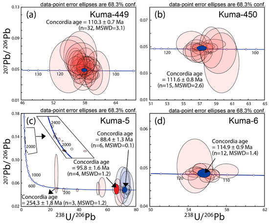 The U-Pb ages for 90 analytical spots for 85 zircon grains from the Himenoura Group and Goshoura Group of SW Japan are shown in Table A1 and Figure 3. Most zircon grains yield concordant or slightly discordant U-Pb ages. In the samples other than one (Kima-5), each single concordia age was obtained. The two samples of the Goshoura Group (Kuma-449, 450) yield concordia ages of 110.3 ± 0.7 Ma (n = 32, MSWD = 3.1) and 116.8 ± 0.8 Ma (n = 15, MSWD = 2.6), respectively. The lower Hinoshima Formation sample (Kuma-6) of the Himenoura group yields a concordant age of 114.9 ± 0.9 Ma (n = 12, MSWD = 1.4). Unlike these, the upper Amura Formation sample (Kuma-5) of the Himenoura group yields a wide range of ages from ca 2360 Ma to 86 Ma. The concordia ages of 88.4 ± 1.3 Ma (n = 6, MSWD = 0.1), 95.8 ± 1.6 Ma (n = 4, MSWD = 1.2), and 254.3 ± 1.8 Ma (n = 3, MSWD = 1.2) were obtained from the sample Kuma-5. Of the four samples analyzed from the Himenoura Group and Goshoura Group, only Kuma-5 has detrital zircons with ages other than Cretaceous, including Jurassic, Triassic, Permian, and Paleoproterozoic ones (Figure 4).