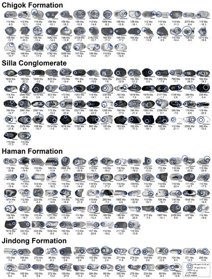 The Gyeongsang Basin is a Cretaceous non-marine sedimentary basin located southeast of the Korean peninsula (Figure 1). The west and north of the Gyeongsang Basin are surrounded by the Yeongnam Massif consisting of Paleoproterozoic metamorphic rocks and Mesozoic granitoids that intrude them. The east and south of the Gyeongsang basin face the sea. The Cretaceous Gyeongsang Supergroup deposited in the Gyeongsang basin consists of Sindong, Hayang, and Yucheon groups in ascending order [30]. The Hayang Group of the Miryang sub-basin is composed of Chilgok Formation, Silla Conglomerate, Haman Formation, and Jindong Formation in ascending order [31]. These formations were deposited in either alluvial, fluvial, or lacustrine environments [32]. In the lower layers of the Gyeongsang Basin, sediments were supplied by waters flowing from the west and northwest [33,34,35,36], but sediments constituting the upper layers were supplied from streams flowing from the east, the direction of the Japanese islands connected to the Korean Peninsula at the time [32,37,38,39]. The maximum depositional ages of the four formations constituting the Hayang Group defined from the youngest U-Pb age populations of detrital zircons are as follows; 109 Ma for the Chilgok Formation, 106 Ma for the Silla Conglomerate, 105 Ma for the Haman Formation, and 100 Ma for the Jindong Formation [19].