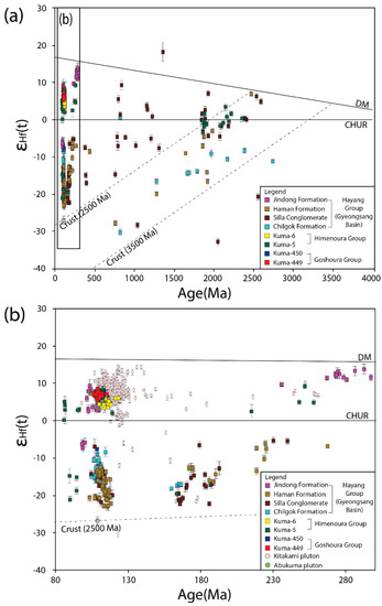 Plot of zircon εHf(t) versus crystallization ages. The evolutionary path of the depleted mantle is based on 176Lu/177Hf and 176Hf/177Hf ratios from Griffin et al. [48]. The evolution lines for the continental crust with ages of 2500 Ma and 3500 Ma were drawn using the Lu/Hf ratio (=0.081) of Rudnick and Gao [49]. (a) Plot of zircon εHf(t) versus crystallization ages for the entire age range. (b) A plot expanded only in the range of about 80–300 Ma.