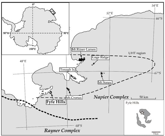 Geological outline of the Napier Complex, Enderby Land, East Antarctica, modified after []. The ultra-high temperature (UHT) region, indicated by a broken line, is composed of sapphirine + quartz in isograd. Bold broken line shows the position of the boundary between the Napier Complex and the Rayner Complex. Black dots indicate outcrops. In the bottom-right inset, the star indicates the approximate location of the YH05021606A sample.