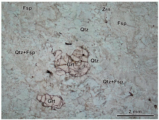 The garnet-bearing quartzo-feldspathic gneiss, YH05021606A, was collected from Fyfe Hills, and the sampling location was E 49°11.533′, S 67°20.875′. The felsic gneiss is mainly composed of garnet + mesoperthite (ternary feldspar) + quartz, with small amounts of zircon and opaque minerals []. The constituent minerals show a granoblastic texture. Garnet is porphyroblastic, and its grain size varies from <1 to 3 mm in diameter (Figure 2). Hydrous minerals are typically lacking in the rock, which is consistent with the >900 °C UHT metamorphic conditions. The sample was collected by Y.H. during fieldwork on the 2004–2005 Japanese Antarctic Research Expedition. Because the field survey in these areas was conducted in a short time, the field relationship of these samples is not clear []. The zircon U–Pb ages of the YH05021606A sample have already been reported in [] and show multiple age peaks centered at ca. 3025, 2943, 2883, 2818, 2759, 2674, 2518, and 2437 Ma.