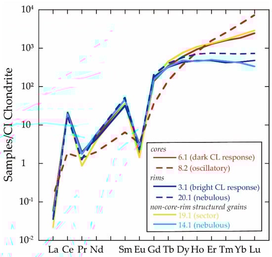 The results are listed in Table S2. Typical REE abundance patterns normalized by C1-chondrite values [] of YH05021606A zircons are shown in Figure 5. The REE patterns of the zircons are characterized by a large fractionation between light REE (LREE: La, Pr, and Nd) and heavy REE (HREE: Tm, Yb, and Lu), positive Ce anomalies, and negative Eu anomalies. The REE patterns obtained from the rims are characterized by a weak fractionation between middle REE (MREE: Gd, Tb, and Dy) and HREE (HREE/MREE = 0.41–1.53) rather than those of the cores (HREE/MREE = 1.10–10.44) (Table S2). In the cores, the REE patterns show a wider variation in LREE to HREE (HREE/LREE = 32–1491), especially negative Eu anomalies (Eu/Eu* = 0.016–0.379; Eu* is defined as (Sm + Gd)/2 in the normalized REE patterns []) (Figure 5; Table S2). The REE patterns of the non-core-rim structured grains with oscillatory or sector zoning (HREE/MREE = 0.49–7.29, HREE/LREE = 34–1505, and Eu/Eu* = 0.014–0.617) are similar to those of cores (Figure 5; Table S2). Those of the non-core-rim structured grains with nebulous to fir-tree zoned textures (HREE/MREE = 0.23–1.98, HREE/LREE = 9–159, and Eu/Eu* = 0.014–0.078) are similar to those of rims (HREE/MREE = 0.41–1.53, HREE/LREE = 11–133, and Eu/Eu* = 0.014–0.234).