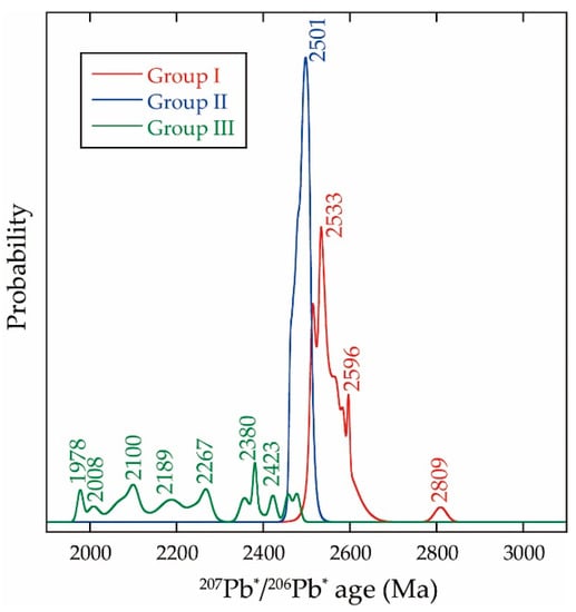 The U–Pb data in the sample reveal a wide age distribution, ranging from 1978 Ma to 2809 Ma in 207Pb*/206Pb* age (Figure 4; Table S1), and a probability density diagram of 207Pb*/206Pb* ages shows multiple age peaks (Figure 4). The major age peaks are centered at ca. 2809 Ma, 2596 Ma, 2533 Ma, 2501 Ma, 2423 Ma, 2380 Ma, 2267 Ma, 2189 Ma, 2100 Ma, 2008 Ma, and 1978 Ma (Figure 4). The age data obtained in this study are consistent with those reported in []; however, age peaks centered at 3025 Ma, 2943 Ma, 2759 Ma, and 2674 Ma were absent in the present study. Moreover, the age peaks younger than ca. 2400 Ma (2380 Ma, 2267 Ma, 2189 Ma, 2100 Ma, 2008 Ma, and 1978 Ma) were not reported in [].