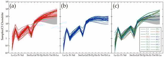 The REE abundances in zircons were determined using SHRIMP-IIe, using the same spots as the U–Pb analyses. An O2− primary ion beam of 1.0–1.5 nA was used to sputter an analytical spot approximately 10 μm in diameter. Mass peaks from 89Y+ to 180Hf+ were scanned under a high-mass-resolution mode (M/ΔM: ~9000) to prevent isobaric interferences from light REE oxide species onto heavy REE mono-atomic species [,,]. The counts for each element are referenced to 96Zr+ derived from the matrix component of zircon. To calculate the elemental abundances of REE, 91,500 zircon [] was used as the reference material.