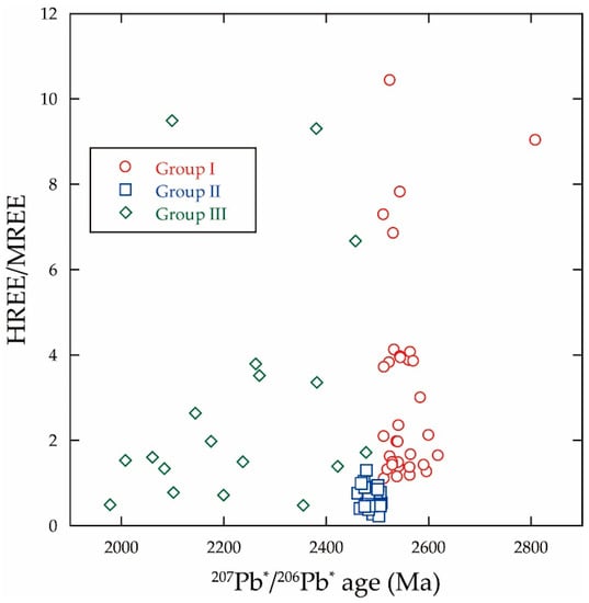 The C1-chondrite-normalized REE patterns of Group III are shown in Figure 7c. The ages of spots 10.1 and 33.1 are 2478 ± 7 Ma and 2457 ± 7 Ma (Table S1), respectively, which are consistent with the age of Group II, whereas the REE patterns of spots 10.1 and 33.1 (Figure 7c) are similar to those of Group I. The CL image and REE pattern indicate that spots 10.1 and 33.1 are the domains of Group I (Table S1); therefore, both spots should be omitted from the age estimation of the local metamorphism. The REE patterns of spots 7.1, 43.1, 46.2, and 64.1 are similar to those of Group II (Figure 7c), and their HREE/MREE ratios (0.48, 0.72, 0.78, and 1.53, respectively; Table S2) are consistent with those of Group II. The CL image and REE pattern suggest the similarity of spots 7.1, 43.1, 46.2, and 64.1 with Group II (Tables S1 and S2). In addition, the core (spot 10.1: 2478 ± 7 Ma) of grain no. YH1606A-10 is younger than the rim (spot 10.2: 2502 ± 7 Ma) (Figure 3b), which indicates radiogenic Pb loss from the core. Therefore, the younger age distribution results in a disturbance of the U–Pb system in the domains of Group I and II.