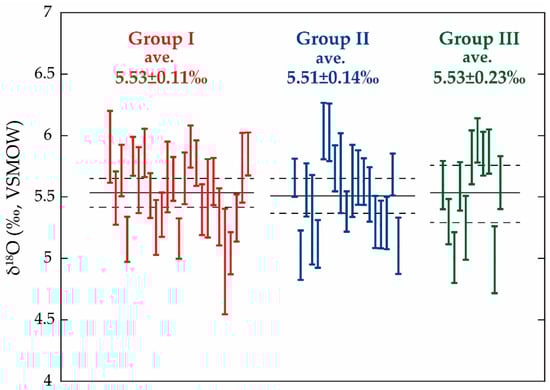 δ18OVSMOW of YH05021606A zircons. The classification corresponds to the classification in Table 1. Error bars indicate 95% confidence. Black lines indicate the averages, and black dotted lines indicate the 95% confidence error ranges of the data of each classification.