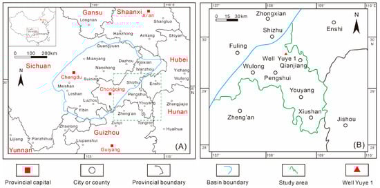 (A) Regional map of southeastern Chongqing, China, which is modified from Ren et al. (1997) [41]; (B) Location map of Well Yuye 1.