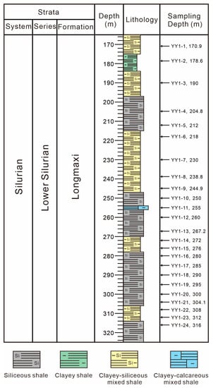 All samples were collected from Well Yuye 1 (Figure 1B). This well is located in Lianhu Town, Pengshui County, Chongqing Province, in the eastern part of Qiyao Mountain and is situated structurally at the axis of the Guochangba anticline [39,40]. The drilling depth of Well Yuye 1 was 325.48 m, and a continuous core of the main black shale section of the Longmaxi formation was obtained [35]. In this study, 24 samples were collected from depths ranging from 170.9 m to 316.0 m (Figure 2). The samples were analyzed to investigate the origin of silica in the Lower Silurian Longmaxi shale.