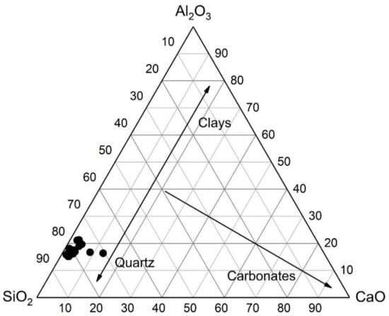 The ternary plot of SiO2-Al2O3-CaO shows that the Longmaxi shales are enriched in SiO2. The base map is from Ross and Bustin (2006) and Zhao et al. (2016) [23,24].