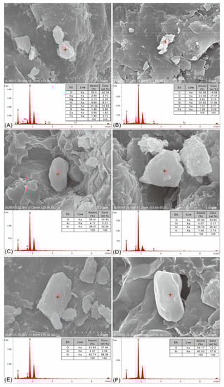 The SEM observations and EDS analysis of the samples of the Longmaxi shale indicate a considerable amount of cryptocrystalline silicas with inferior crystallinity and irregular shape, and some crystals even have a high concentration of C element (Figure 5). It is obviously different in the morphology from terrigenous detrital silica (with subrounded, subangular, and angular outlines), the authigenic silica formed during smectite-illite transformation (granular silica, grain size is <1 μm; sheet-like silica, thickness is <100 nm), and the hydrothermal silica (trigonal structure) [11,12,47].