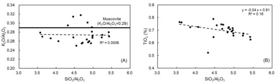 Normalization of the elements to Al is common practice in the assessment of detrital input [28,54]. The uniform K2O/Al2O3 ratios of the Longmaxi shales are consistent with terrestrial muscovite, whose molar proportion of K2O/Al2O3 is 0.29 [28]. However, there is no correlation between K2O/Al2O3 and SiO2/Al2O3 (Figure 6A). In terms of TiO2, there is a negative correlation with SiO2/Al2O3 (Figure 6B). These results provide evidence that a considerable proportion of silica in the Longmaxi shale is nondetrital input [28].