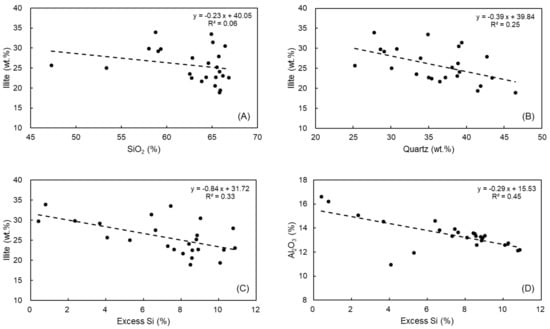 According to Equation (2), when 787.2 g illite is generated, 197.7 g SiO2 is released during the smectite to illite reaction. As a result, the content of authigenic silica formed during clay mineral transformation should be positively correlated with the illite content. However, the illite content is uncorrelated with the SiO2 content (Figure 7A) and negatively correlated with the quartz content (Figure 7B) and the excess Si content (Figure 7C). In addition, there is a negative correlation between the Al2O3 content and excess Si content (Figure 7D).