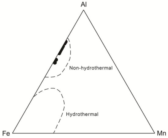 Adachi et al. (1986) proposed the Al-Fe-Mn diagram, which shows the difference in chemical composition between hydrothermal and non-hydrothermal siliceous rock [29]. The influence of hydrothermal activities on the chemical composition of the Longmaxi shales can be identified using this diagram [9]. In the Al-Fe-Mn diagram, all the samples of the Longmaxi shales have extremely low Mn concentrations and are located in the non-hydrothermal origin area, indicating that hydrothermal activities had no effect on the Longmaxi shales during sedimentation and diagenesis and a large proportion of the silicas was not derived from hydrothermal dissolution (Figure 8).