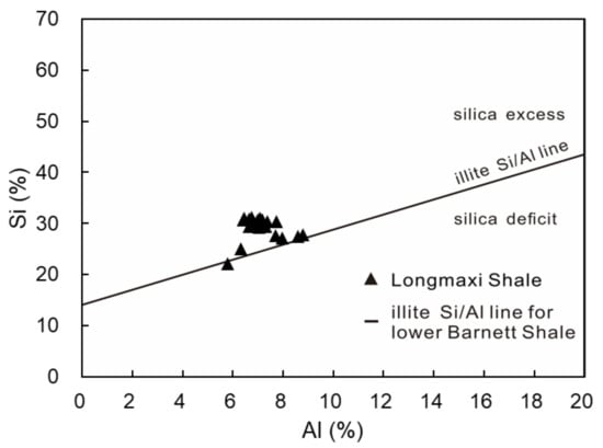 The calculation results of the major oxides of the Longmaxi shales indicate that all samples have high SiO2/Al2O3 ratios (Table 2), ranging from 3.57 to 5.43, with an average of 4.69. It is generally believed that the ratio of SiO2/Al2O3 in the average crust is about 3, and it has been suggested that if ratio of SiO2/Al2O3 is greater than 3, the portion of SiO2 exceeding Al2O3 can be regarded as biogenic silica [51]. Moreover, in the cross-plot of Si versus Al, almost all the samples of the Longmaxi shales are located in the area above the illite Si/Al line (Figure 9), showing that they have excess Si, which is indicative of a considerable proportion of biogenic silica [30].