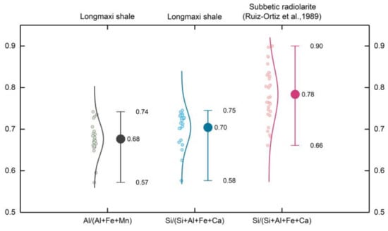 Furthermore, the Si/(Si + Al + Fe + Ca) ratio is used to estimate the biogenic silica content of shales [31,53]. The value of Si/(Si + Al + Fe + Ca) for 30 samples of Middle and Late Jurassic radiolarites of the Subbetic in southern Spain ranges from 0.661 to 0.90 (average: 0.784) (Figure 10) [31]. Meanwhile, the Si/(Si + Al + Fe + Ca) ratio of the Longmaxi shales ranges from 0.58 to 0.75 (average: 0.70) (Table 2, Figure 10), which is close to the values of the Subbetic radiolarites, demonstrating that the silicas are mainly of biogenic origin. All of the element concentrations are calculated from the oxide contents of the major elements.