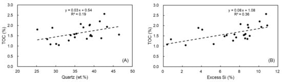 Relationship between the TOC content and the quartz and excess Si contents of the Longmaxi shales. (A) TOC vs. quartz. (B) TOC vs. excess Si.
