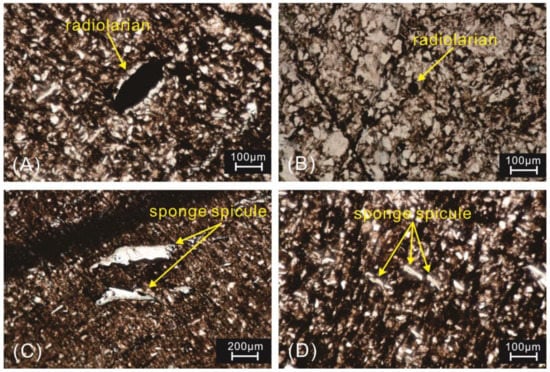 Thin section analysis of the samples of the Longmaxi shales from Well Yuye 1 indicates a considerable amount of ancient organism microfossils, primarily radiolarians and sponge spicules (Figure 12). The ancient organism microfossils provide evidence for the presence of biogenic silica [34,58,70].