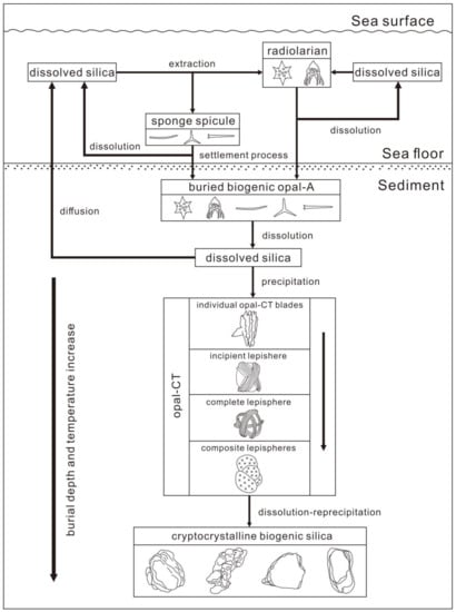 Principal scheme showing the cycle and diagenetic transformation of biogenic silicas in the Longmaxi shales. The radiolarian and sponge spicule are from Editorial Committee of A Dictionary of Earth Sciences (2006) [80]. The individual opal-CT blades and incipient lepisphere are from Riech and von Rad (1979) [74]. The complete lepisphere is from von Rad et al. (1978) [77]. The composite lepispheres are from Flörke et al. (1976) [78]. The cycle and diagenetic transformation of silicas are modified from Heath (1974), von Rad et al. (1978), and Riech and von Rad (1979) [74,75,77]. The cryptocrystalline biogenic silicas are the sketches of the observed silicas in the Longmaxi shales.