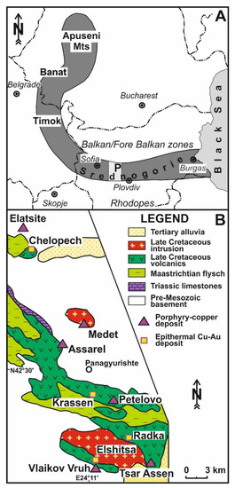 - Strashimirov, S.; Bogdanov, K.; Popov, K.; Kehayov, R. Porphyry system of the Panagyurishte ore region. In Cretaceous Porphyry-Epithermal Systems of the Srednogorie Zone, Bulgaria; Society of Economic Geologists Guidebook Series; Bogdanov, K., Strashimirov, S., Eds.; Society of Economic Geologists: Sofia, Bulgaria, 2003; Volume 36, pp. 47–78. [Google Scholar]