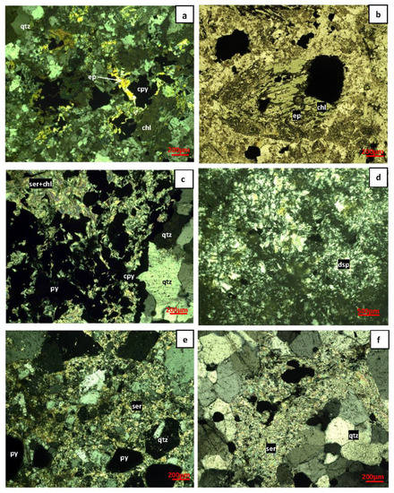 - Thompson, A.J.B.; Thompson, J.F.H. Atlas of Alteration. A Field and Petrographic Guide to Hydrothermal Alteration Minerals; Geological Association of Canada, Mineral Deposits Division: St. John’s NL, Canada, 1996; p. 119. [Google Scholar]