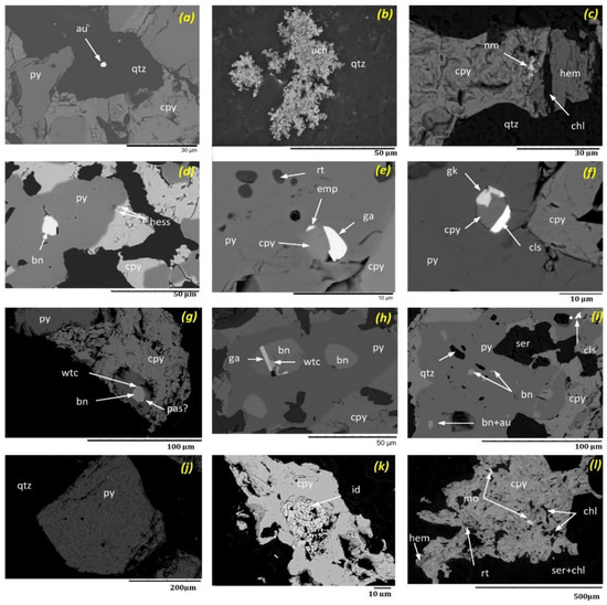 - Magnetite-hematite (±ilmenite, rutile) ± bornite, chalcopyrite is an early mineral assemblage. Tarkian et al. [23] refer to this assemblage as “magnetite–chalcopyrite–bornite” at the Elatsite deposit, mentioning the hematite as a secondary phase formed on magnetite.