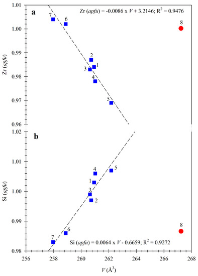 The variations of the unit-cell volume, V, with the concentrations of Zr and Si are shown in Figure 4. The V increases with decreasing Zr apfu and with increasing Si apfu. Metamict sample 8 is far away from the two linear regression lines because the V is significantly higher than the other samples. The increase of V for sample 8 is not related to the concentrations of Zr and Si apfu (see Figure 5). The large V for sample 8 arises from radiation damage.