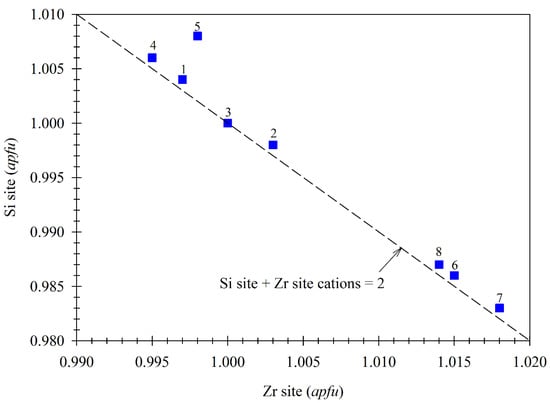 The Hf, U, Th, Ca, Y, Fe, Mn, Ni, and Mg have 8-coordination and close proximity to Zr in terms of their ionic radii, so they substitute for the Zr atom. Only S atom, which has 4-coordination and close in size to Si can substitute for the Si atom. The sum of Zr site cations is plotted against the sum of Si site cations (Table 1, Figure 5). Sample 3 has ideal stoichiometry because the concentration of cations in the Zr and Si sites is 1.0 apfu (Table 1). All samples, except sample 5, fall close to a dashed diagonal line representing the sum of Zr and Si site cations = 2 (Figure 5). Samples 6 and 7 show slight non-stoichiometry and display excess cations on the Zr site, which is inversely related to slight deficit in the Si site. Hancher et al. [42] demonstrated that the excess Zr site cations might occupy Si cation site for REE- and P-doped synthetic zircon crystals. The excess Zr site cations in samples 6 and 7 may occupy the Si site or open spaces in the zircon structure. Sample 5 displays the stoichiometric imbalanced relation between Zr and Si site cations. Substitutions for Zr in sample 5 are higher than that for the other samples. Because most of the cations incorporated in sample 5 have ionic radii larger than that of the Zr atom, the V increases (Figure 4).