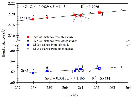 The average <Zr-O> and Si-O distances increase linearly with V for the 7 zircon samples. The solid and dashed lines denote linear fits with data from this study and their equations are given as inserts.