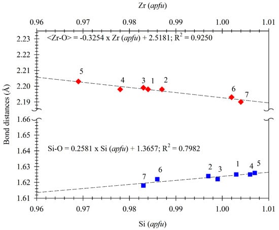 Variations of average <Zr-O> distances with Zr and Si-O distances with Si. The dashed lines denote linear fits and their equations are given as inserts. The Si-O distance increases linearly with increasing Si apfu, whereas the <Zr-O> distance decreases linearly with Zr apfu.