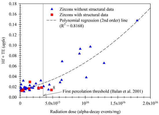 Variations of ∑(Hf + TE) with radiation dose for 52 zircon crystals (see Table 2). The radiation doses for samples 1 to 7 are below the 1st percolation threshold value (3.5 × 1015 α-decay events/mg). Only the metamict sample 8 received the radiation dose above the 1st percolation threshold value.