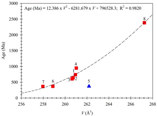 The radiation dose for zircon increases with increasing geological age [46]. The control of such age on the unit-cell volume, V, is unknown. However, Figure 9 shows a relation between age and V. Samples 6 and 7 are the youngest zircon samples and have the smallest V. This suggests that they are pure zircon with high crystallinity. Samples 1 to 4 have relatively older ages and have larger V. The metamict sample 8 is oldest and has the largest V. A positive correlation is obtained where V increases with age (Figure 9). Sample 5 is an outlier and has a high V, although it is relatively young. Some larger atoms (e.g., Fe, Y, Ca, etc.; Table 1) may occupy the Zr site and cause high V for sample 5.