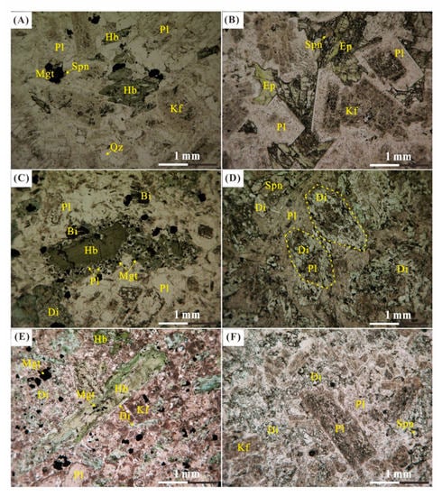 Microphotographs in transmitted light illustrate the characteristics of altered plutonic rocks from the Han-Xing iron deposit. (A) Fresh quartz diorite (FS-01) with medium-grained equigranular texture; it is characterized by fresh euhedral hornblende. (B) Intensively altered quartz diorite (FS-02); hornblende has been replaced by epidote without magnetite residual. (C) Less altered diorite (FS-03); at the edge of hornblende, it has been altered to the aggregates of diopside, albite, magnetite and biotite. (D) Intensively altered diorite (FS-04); euhedral hornblende has been totally replaced by the diopside remaining with its previous morphology. (E) Less altered monzodiorite (BJ0818-23); hornblende has been altered to the diopside and magnetite. (F) Intensively altered monzodiorite (BJ0818-21); hornblende and magnetite have been dissolved from the monzodiorite, leaving the plagioclase and diopside as residuals. Abbreviations: Hb—hornblende; Di—diopside; Bi—biotite; Ep—epidote; Pl—Plagioclase; Kf—K-feldspar; Qz—quartz; Spn—sphene; Mgt—magnetite.